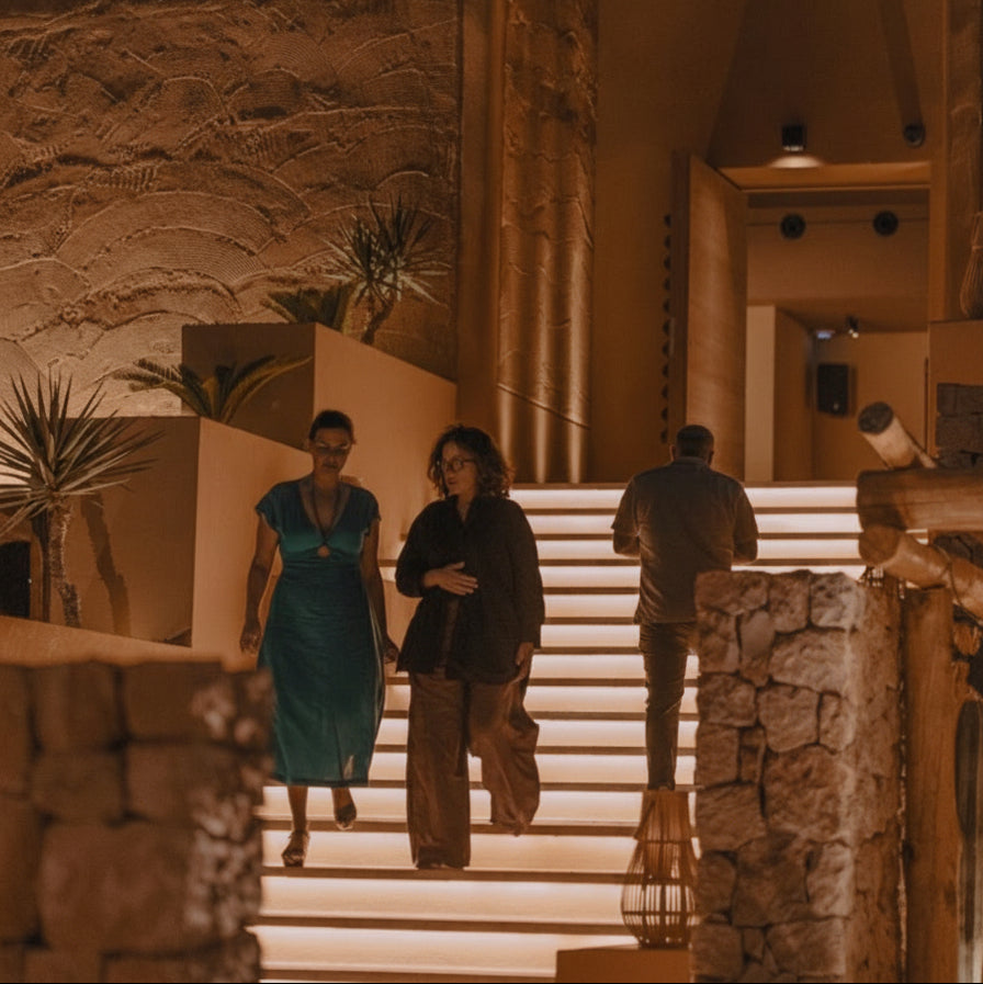 Guests arrive at the top and descend via a broad, illuminated stair – a processional spine that becomes both entrance and viewpoint. From there, paths branch into intimate pockets and larger tables, always keeping the sea and sky in view.