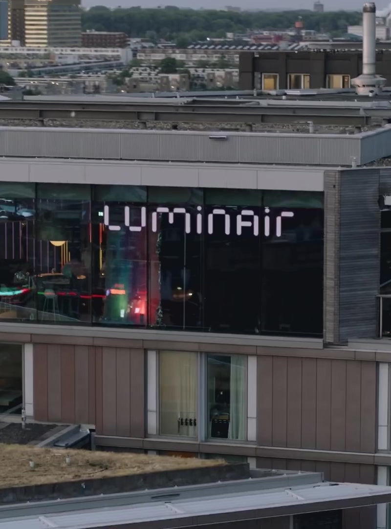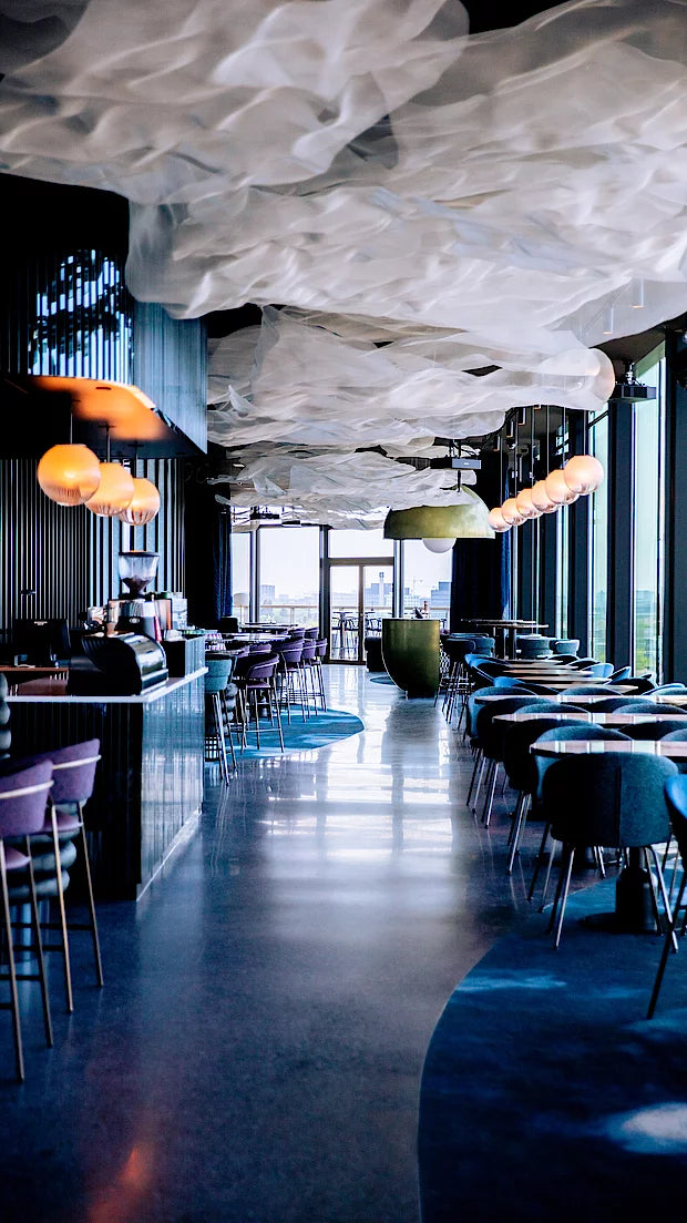 LuminAir is conceived as a bar that behaves like its own weather system: an interior extension of the Amsterdam sky. Pulsing “cloud” elements shift the room from soft dusk to electric night.