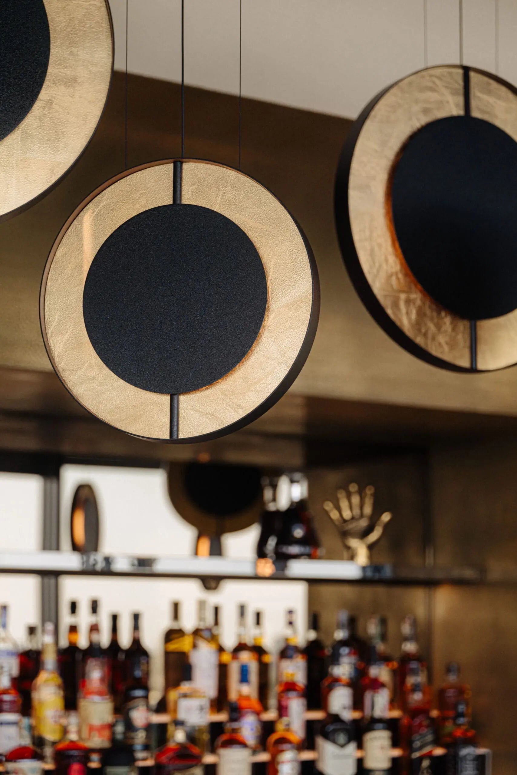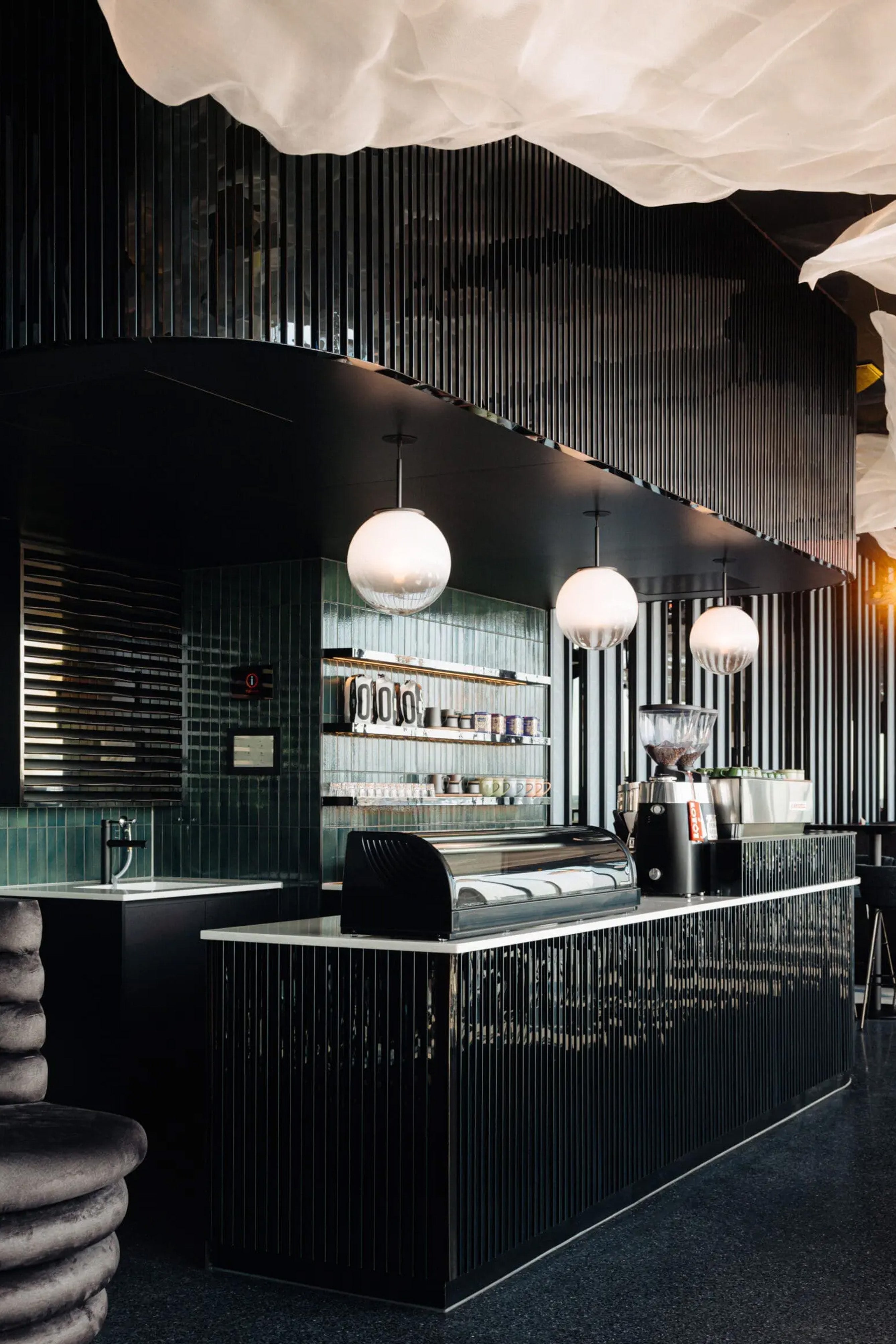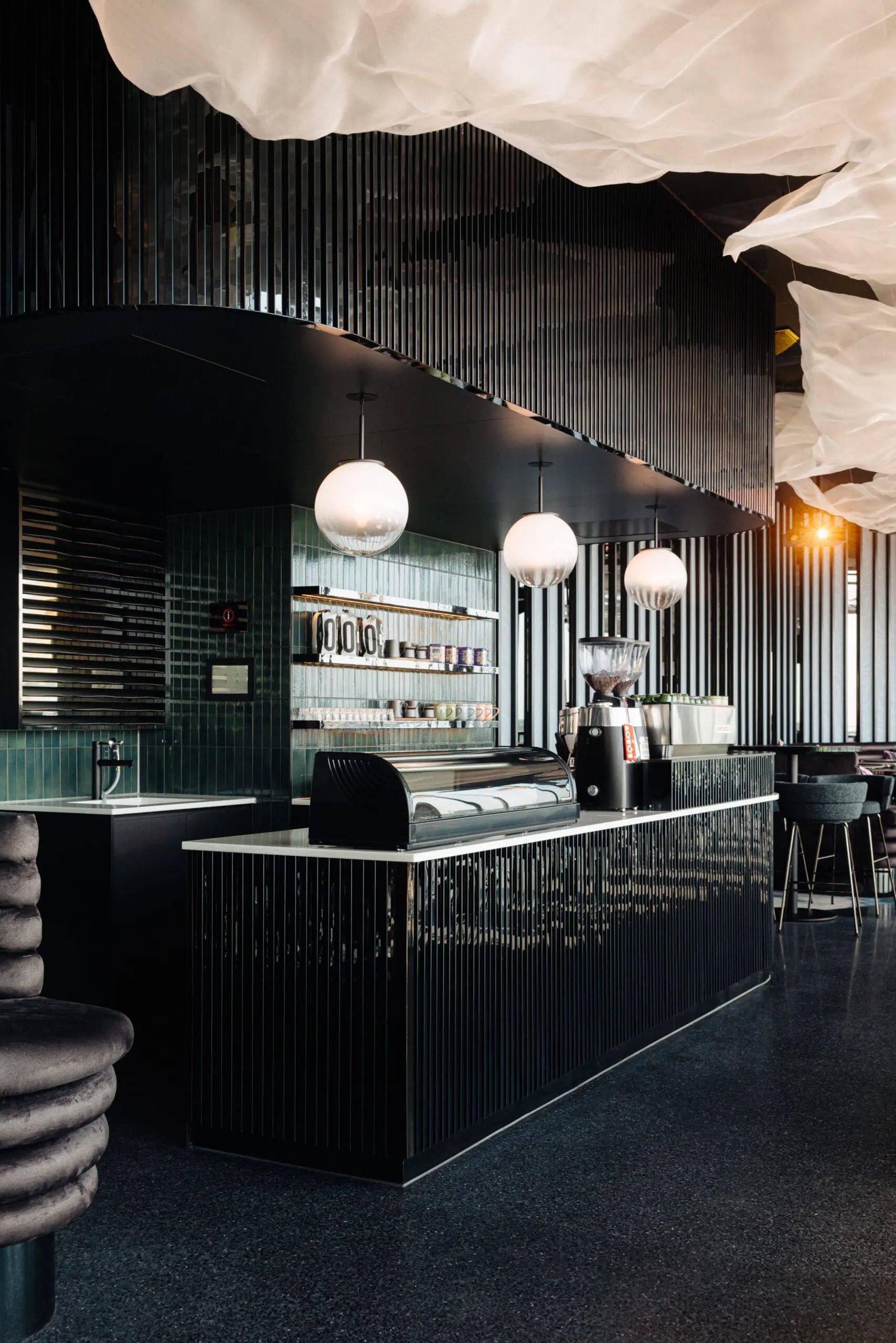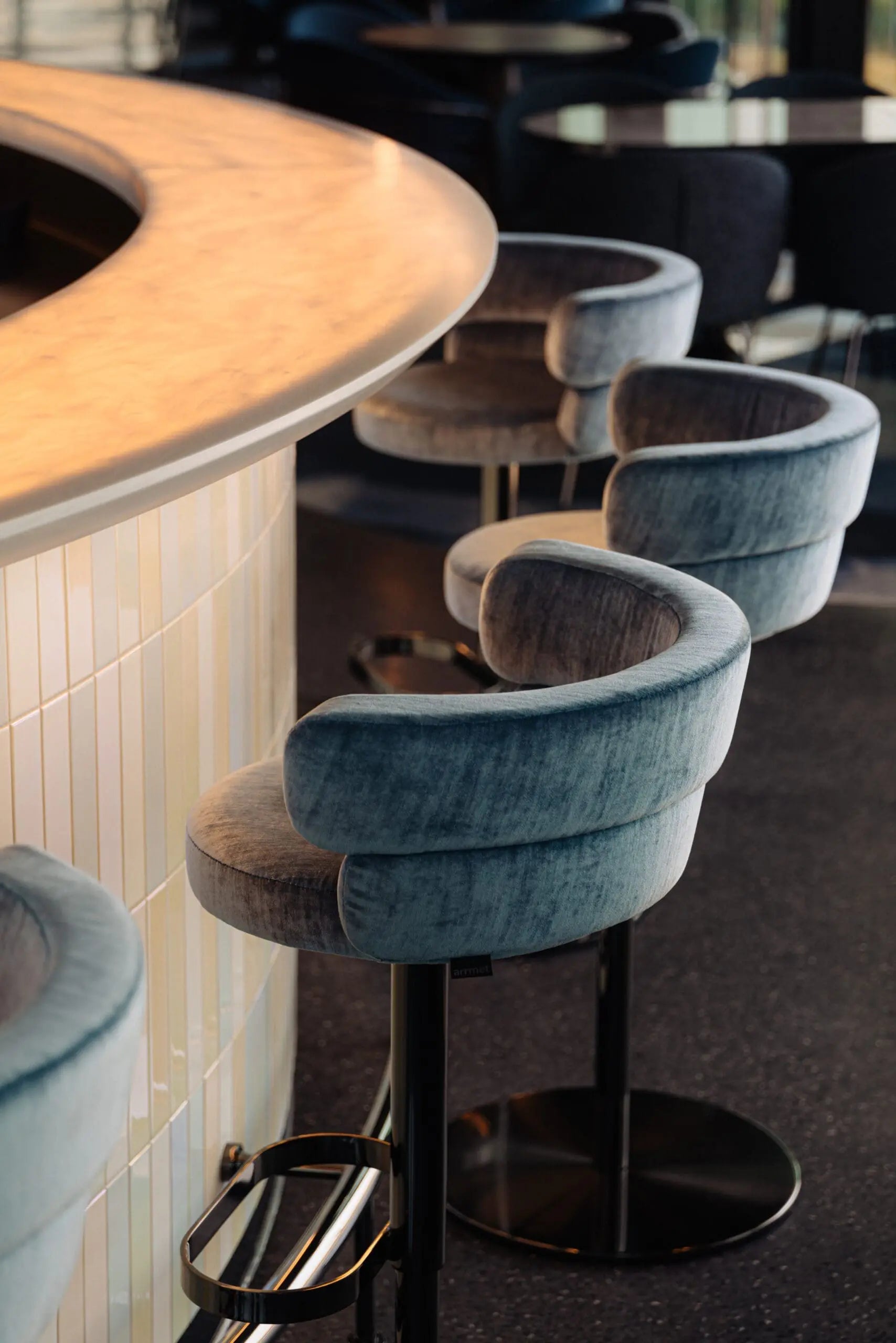 A dark terrazzo floor, warm metals and textured upholstery are chosen to catch and soften light rather than compete with it.